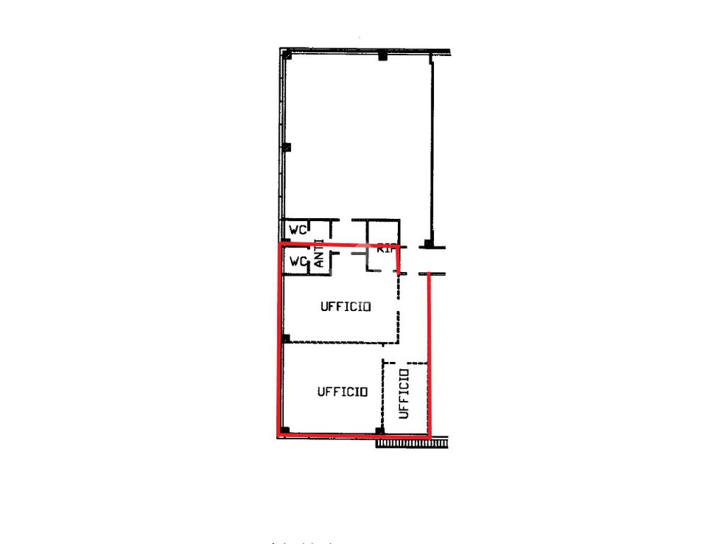 L'immobile è situato al primo piano con ascensore, internamente composto da un ampio vano open space al quale si aggiungono tre stanze divise con pareti attrezzate e servizio interno. I locali risultano ampiamente illuminazione grazie alle finestrature che corrono sui due lati dell’immobile, mentre le finiture interne sono di buon livello grazie alla ristrutturazione interna eseguita recentemente.