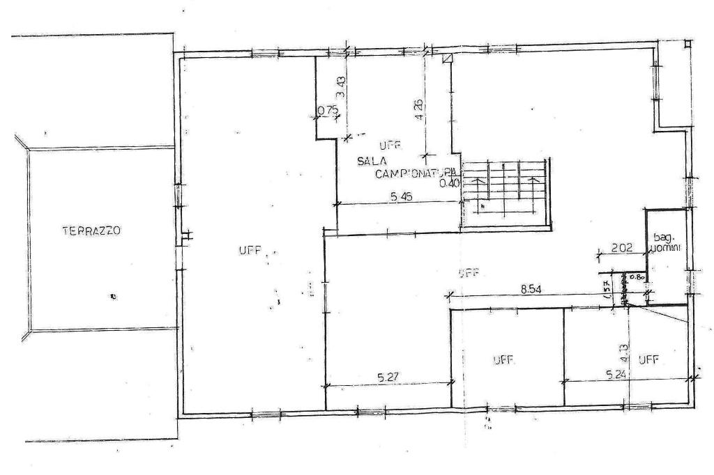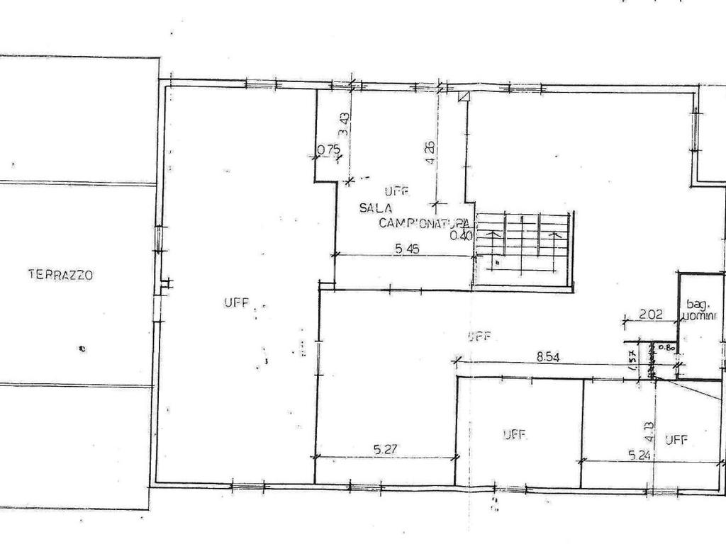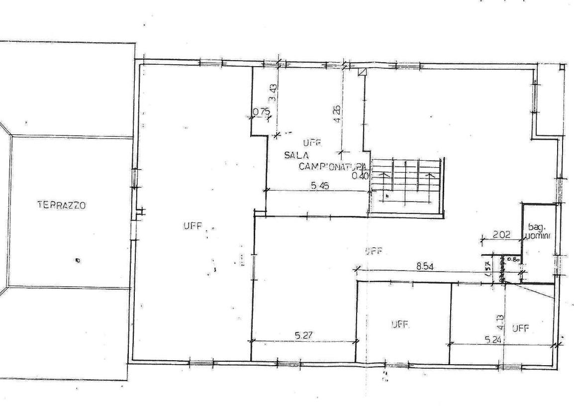 Al primo piano dispone di 300 mq circa ad uso ufficio, disposti in 7 stanze realizzate in cartongesso, rendendo agevoli eventuali modifiche al layout. Dotato anche di un terrazzo e un balcone oltre al servizio igienico, vi è la possibilità di destinare 150 mq ad alloggio.