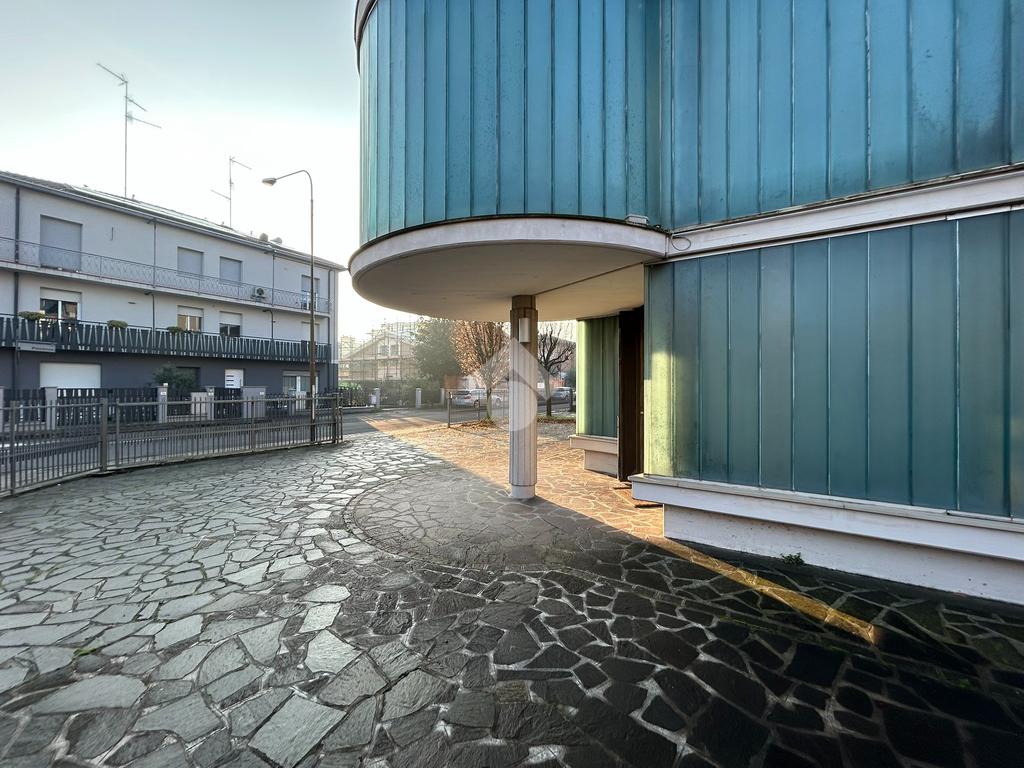 La struttura si distingue per l'impostazione ad angolo e per le ampie vetrate che ricoprono interamente l'immobile. Internamente si compone di due livelli open space. Al piano terra misura 205 mq circa, mentre al piano primo, servito da ascensore, 180 mq, oltre al balcone. La disposizione ad angolo permette una gestione ottimale degli spazi, mentre le grandi vetrate garantiscono un'illuminazione naturale eccellente, creando un ambiente luminoso e accogliente. Il complesso è servito da un cortile privato di circa 150 mq, ideale per chi necessita di un'area esterna da riservare al parcheggio dipendenti o clienti, oppure ad un giardino, se si effettua la conversione ad abitativo. La posizione è molto comoda, a soli 5 minuti dal centro di Carpi e a 200 metri dalla tangenziale, rende questa proprietà particolarmente interessante per chi desidera una soluzione ben collegata ai servizi. Inoltre, la struttura si presta perfettamente per una conversione ad uso abitativo, offrendo la possibilità di trasformare questo spazio in una residenza unica e personalizzata.